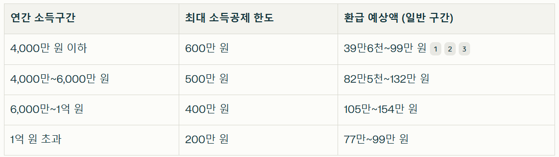 안내대로 소득 수준에 따라 공제 한도와 환급액은 구분됩니다. 환급액은 개인의 실제 세율에 따라 달라질 수 있습니다.