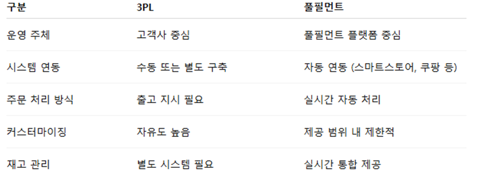 3PL은 유연한 운영과 커스터마이징에 강점이 있는 반면, 풀필먼트는 주문 처리 속도와 시스템 연동 효율성이 뛰어납니다.