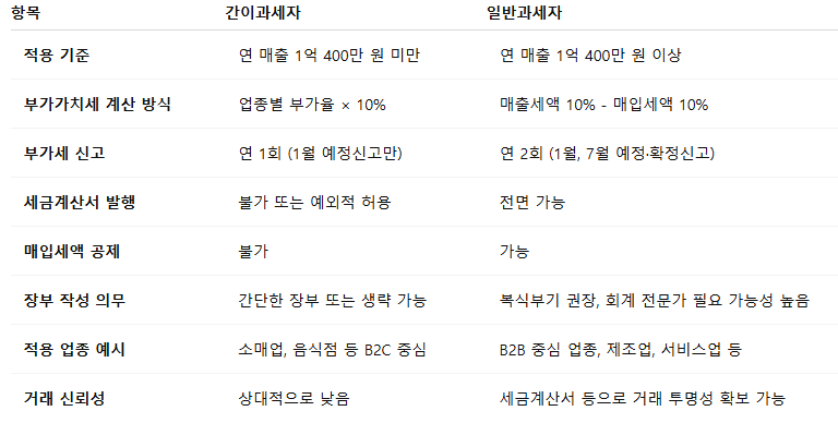 간이과세자와 일반과세자. 간이과세자는 연매출이 일정 기준 이하(2025년 현재 1억 400만원 미만)인