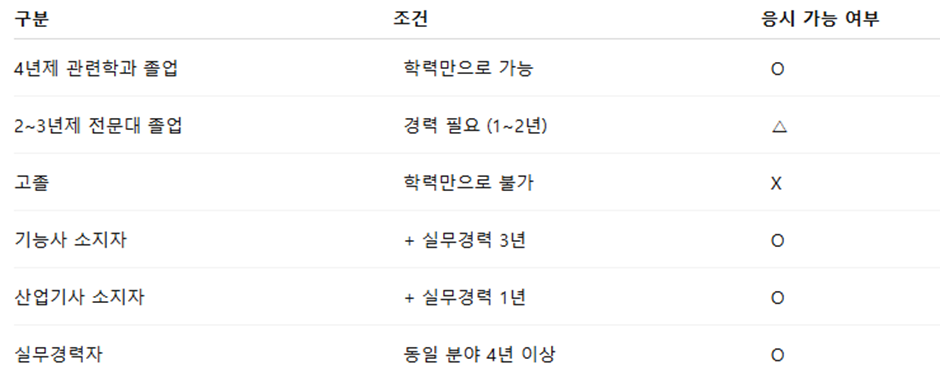o 학력 단독으론 응시 불가, 반드시 자격증+경력 또는 단독 경력 4년 이상 필요